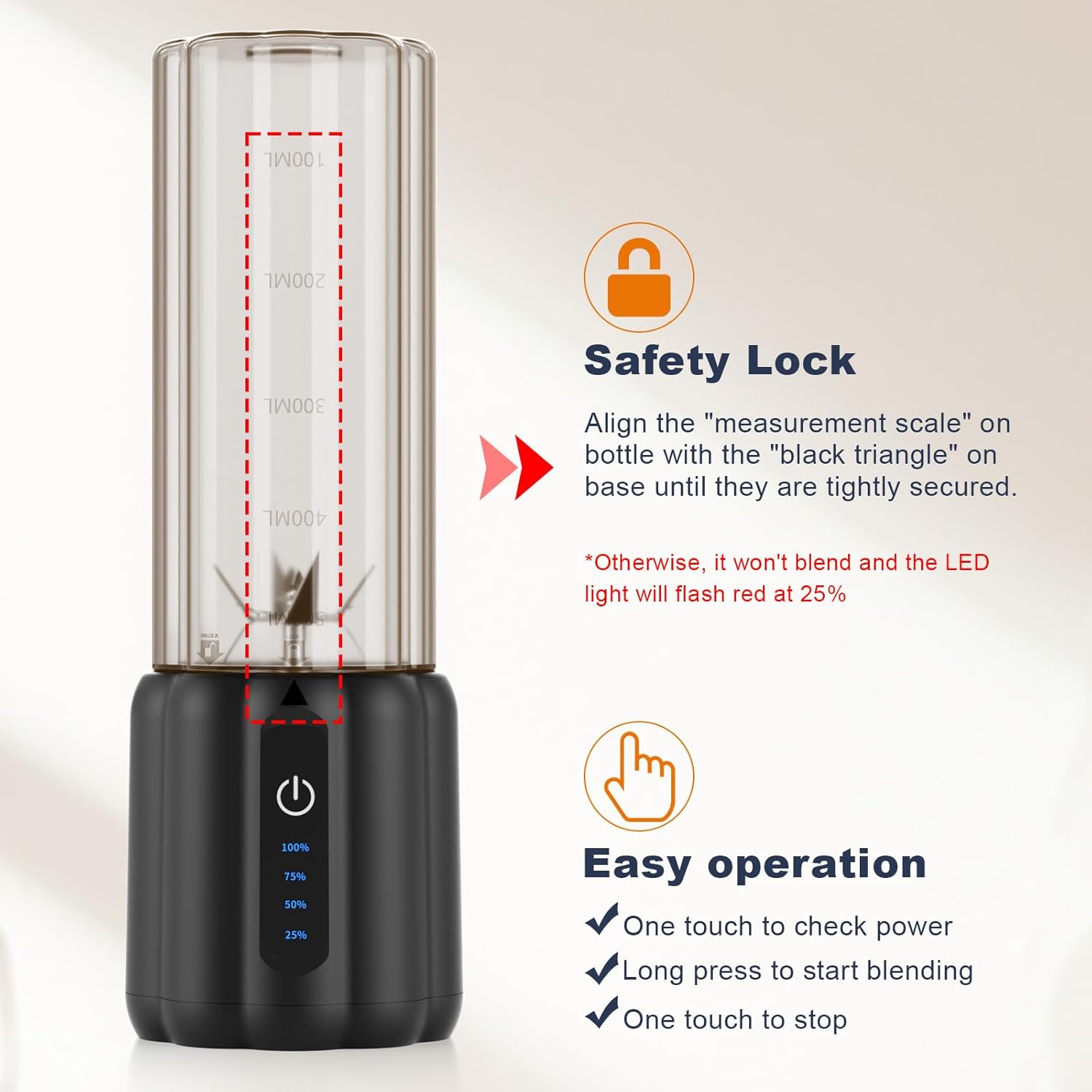 UPGRADED SAFETY LOCK SYSTEM: With our magnetic induction personal smoothie blender, easy to lock/unlock the base with clear icons, and safe to rotate only when the bottle and base are tightly secured. Giving you peace of mind while on the go