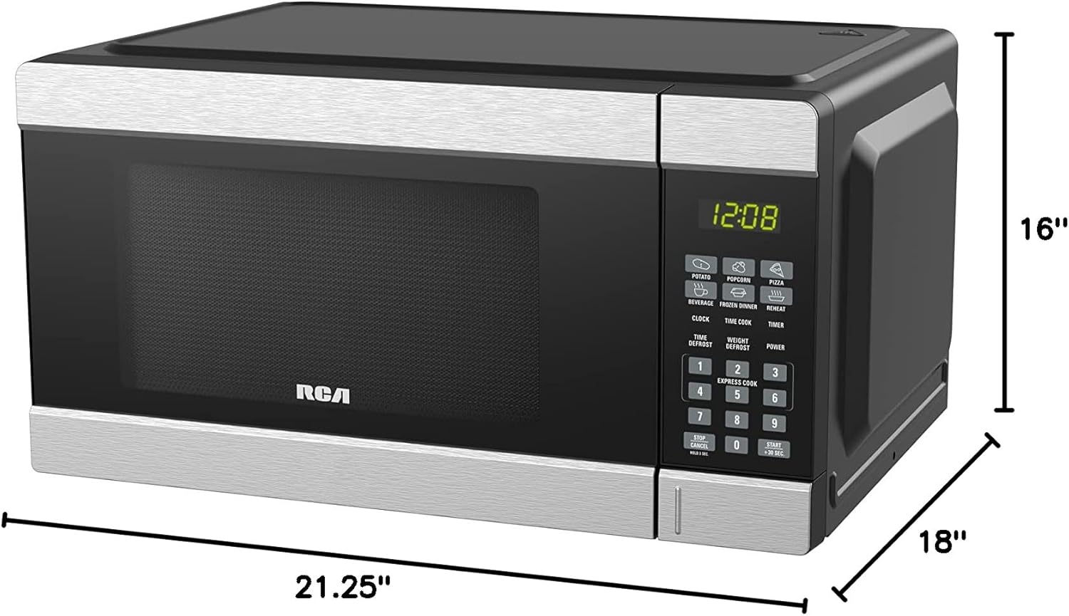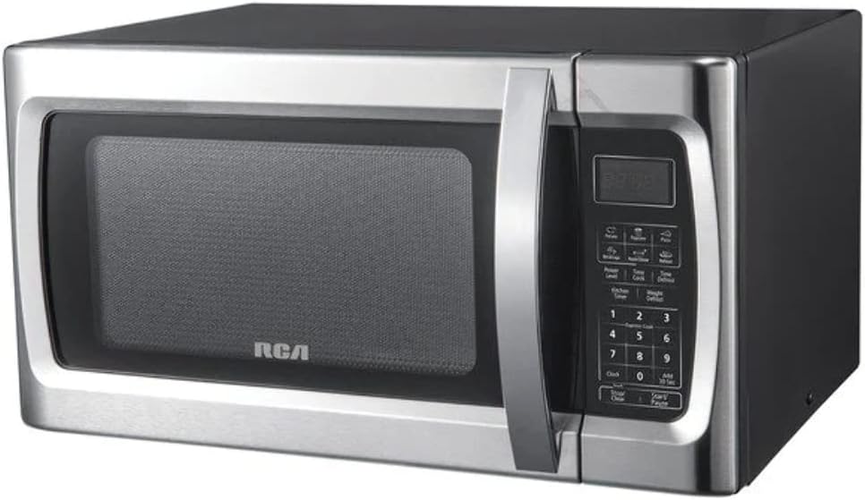 With a 1.1-Cubic-Foot capacity, this stainless steel microwave oven allows for quick and convenient meal preparation. The unit’s one-touch auto-cook menu takes the guesswork out of cooking popularly microwaved foods including popcorn, baked potatoes, pizza, beverages, and frozen dinners, while its reheat button makes it easy to warm food items back up again. The microwave’s soft-touch electronic control panel also comes with cook-by-weight and defrost-by-weight options, speed defrost that alternates between defrost and stand times for efficient results, a start/stop button, and a reset button to clear all previous settings. Choose from 10 power levels for added versatility and control. Other highlights include a removable glass turntable, a handy digital clock and kitchen timer, child safety-lock protection, and an end-of-cycle audio signal, which helps prevent mugs of reheated tea or coffee from being forgotten about. The glass turntable cleans up easily by hand or in the dishwasher, and the interior and exterior of the appliance can be wiped down with a damp cloth as needed. With a sleek Stainless Steel finish, this microwave will look perfect in any kitchen, office or dorm.