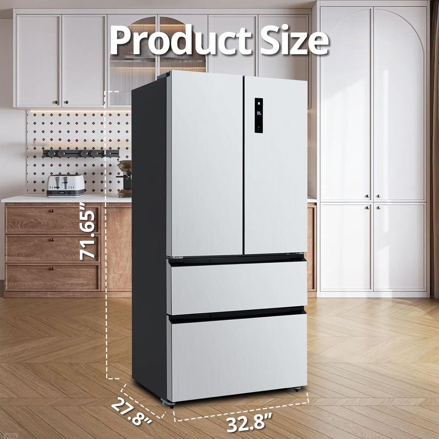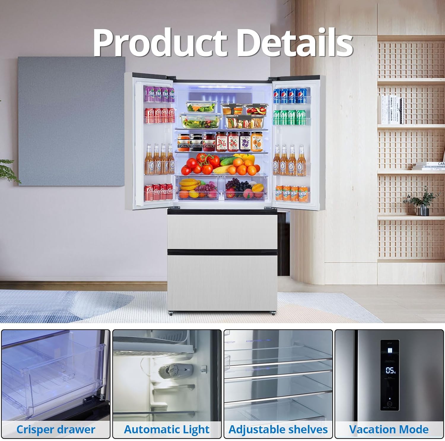 PioneerWorks French Door Refrigerator, 18.8Cu.Ft Large Capacity Kitchen Fridge, Stainless Steel Refrigerators, Digital Temperature Controls, Auto Defrost 4 Door Full Size Counter Depth Refrigerator