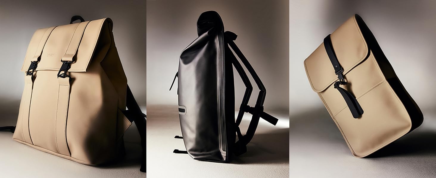 Explore waterproof backpacks from Rains. The collection of waterproof rucksacks offers various silhouettes and sizes. Features include laptop pockets, concealed details, and signature hardware. All constructed from signature waterproof fabrics.